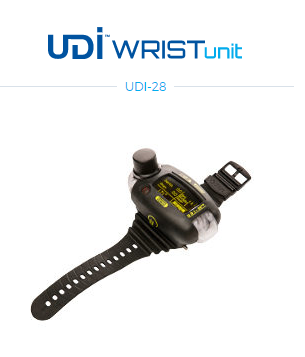 The UDI-28 compact wrist-worn unit is an underwater communication and safety device. This wrist unit connects the diver with the surface vessel upon which the boat unit is located, as well as with fellow divers.